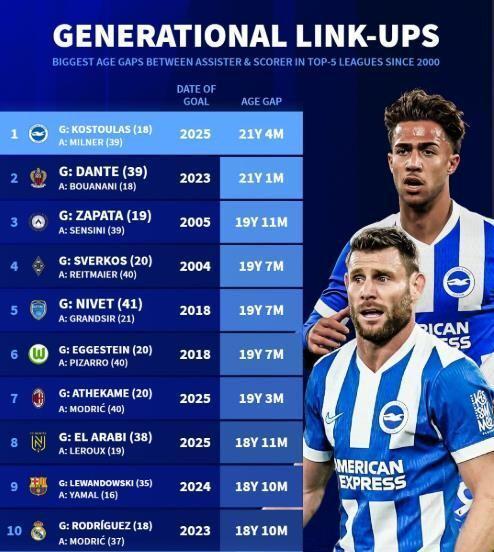 這粒進球成為歐洲五大聯賽歷史上年齡差最大的進球連線,沒有之一(年齡跨度長達21年4個月)。更令人瞠目結舌的事實是,2002年11月10日,當身披利茲聯戰袍的米爾納完成英超首秀,成為英超歷史上最年輕的進球者之一時,被他助攻的科斯圖拉斯,還要再等一段時間才會降臨到這個世界上。